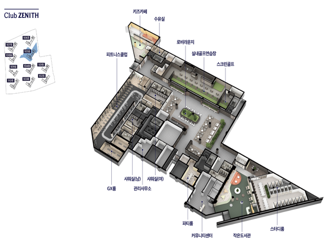 청당 두산위브더제니스는 1,202세대 대단지의 장점을 살려 입주민 전용 커뮤니티 시설을 풍부하게 계획하고 있습니다. 피트니스센터, GX룸, 골프연습장, 실내 스크린골프장 등 운동 시설은 물론 게스트하우스, 키즈카페, 작은 도서관, 카페테리아 등 가족 모두가 즐길 수 있는 다양한 시설이 마련될 예정입니다. 단지 최상층에는 스카이라운지가 조성되어 천안 시내 전경을 한눈에 조망할 수 있는 특별한 공간으로 입주민들에게 제공됩니다.
